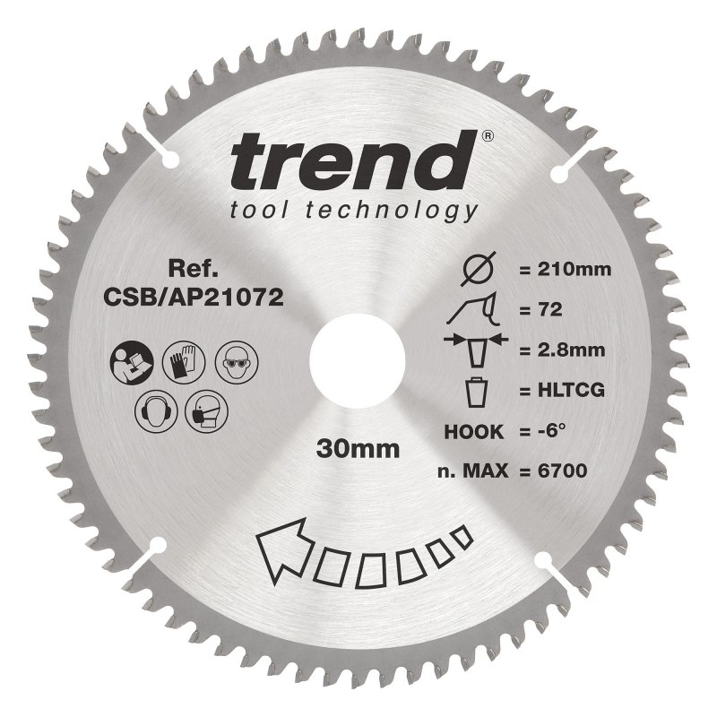 Trend Aluminium / Plastic Circular Saw Blade - 210mm dia x 2.8 kerf x 30 bore 72T