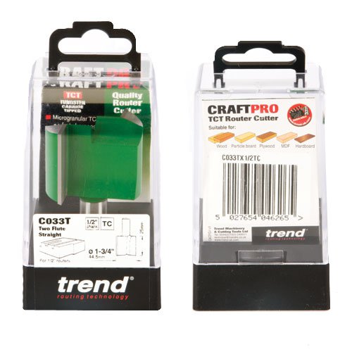 Trend C033TX1/2TC CraftPro Two Flute Straight Router Cutter 44.5mm Dia x 25mm Cut x 1/2 Shank