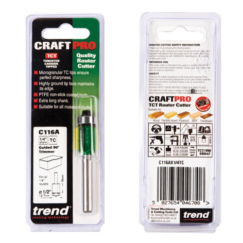 Trend C116AX1/4TC CraftPro Guided Trimmer Router Cutter 12.7mm Dia x 16mm Cut x 1/4 Shank
