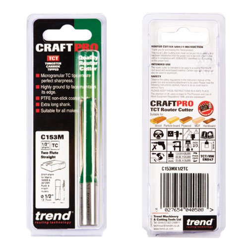 Trend C153MX1/2TC CraftPro Two Flute Straight Router Cutter 12.7mm Dia x 50mm Cut x 1/2 Shank (83mm Length)