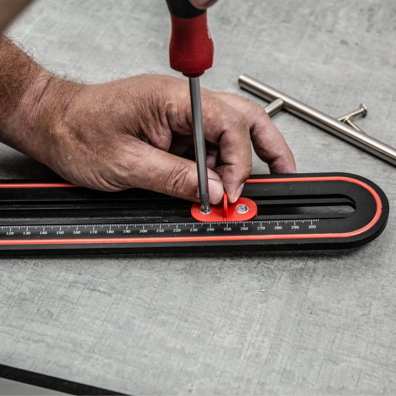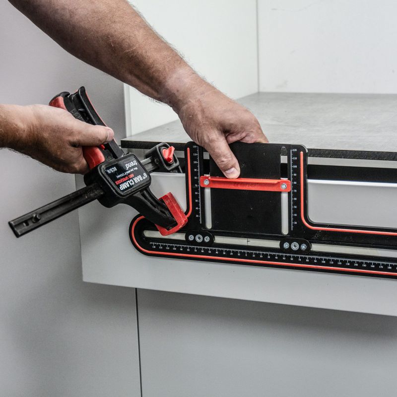 - Protective Rubber Over-Mould prevents damage to doors and drawers when positioning and using the jig.