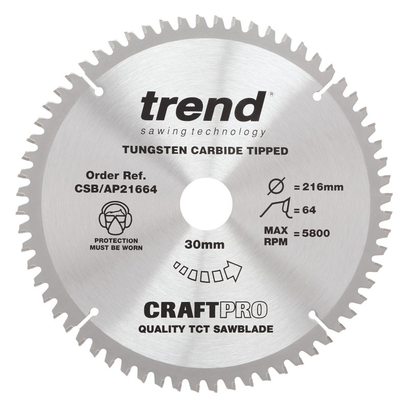 Trend CraftPro Aluminium / Plastic Mitre Saw Blade - 216mm dia x 2.8 kerf x 30 bore 64T