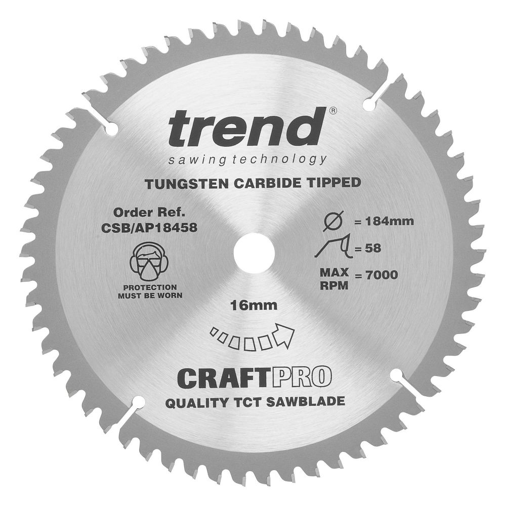 Trend CraftPro Aluminium / Plastic Saw Blade - 184mm dia x 2.8 kerf x 16 bore 58T