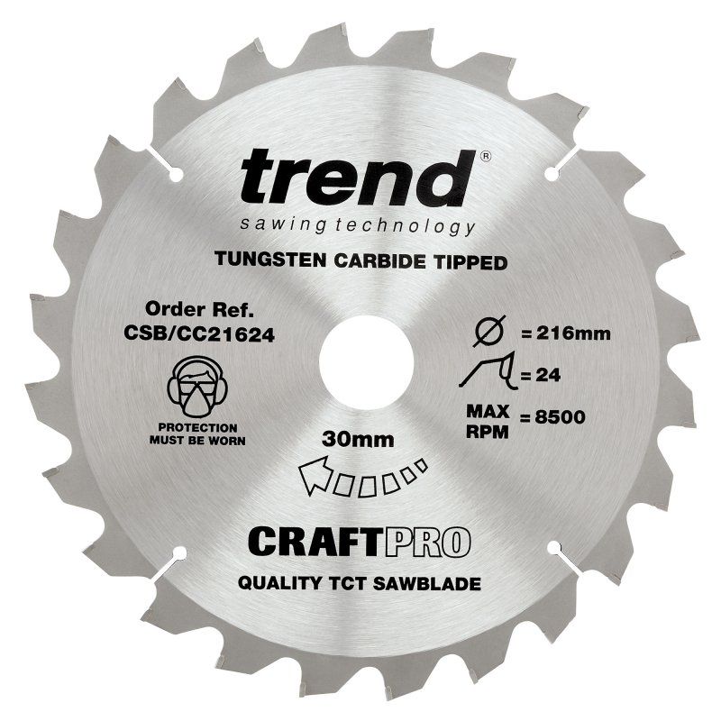 Trend Craft Pro saw blade - 216mm diameter, 30mm bore, 24 tooth, TCT, for mitre saws.