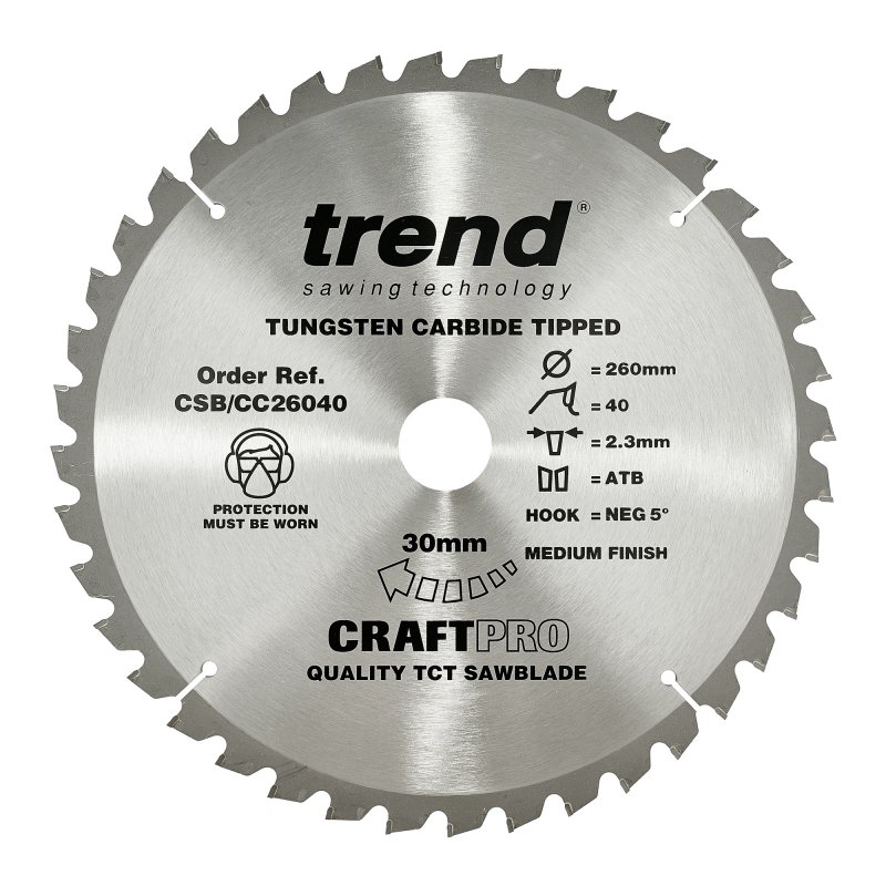 Trend CraftPro Crosscut Wood Mitre Saw Blade - 260mm dia x 2.3 kerf x 30 bore 40T