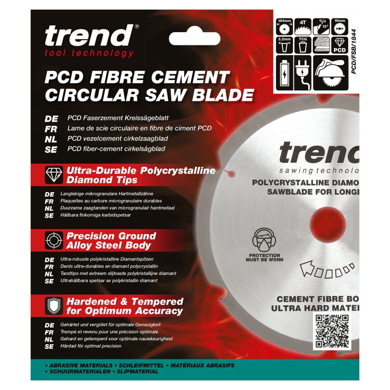 A range of polycrystalline diamond blades for cutting a wide variety of ultra-hard and abrasive materials. For use in circular, plunge, table and mitre saws, Trend PCD Fibre Cement blades are exceptionally durable and retain their cutting edge for longer than TCT alternatives. Ideal for AQUAPANEL¨, HardieBacker¨, gypsum, composite decking & cladding, laminate flooring, fibre & glass reinforced polymer and compact laminate worktops.