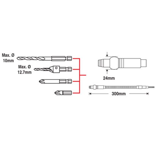 - The 300mm flexible shaft is ideal for gaining access into awkward and inaccessible positions for drilling pilot or clearance holes, countersinking and screwdriving.