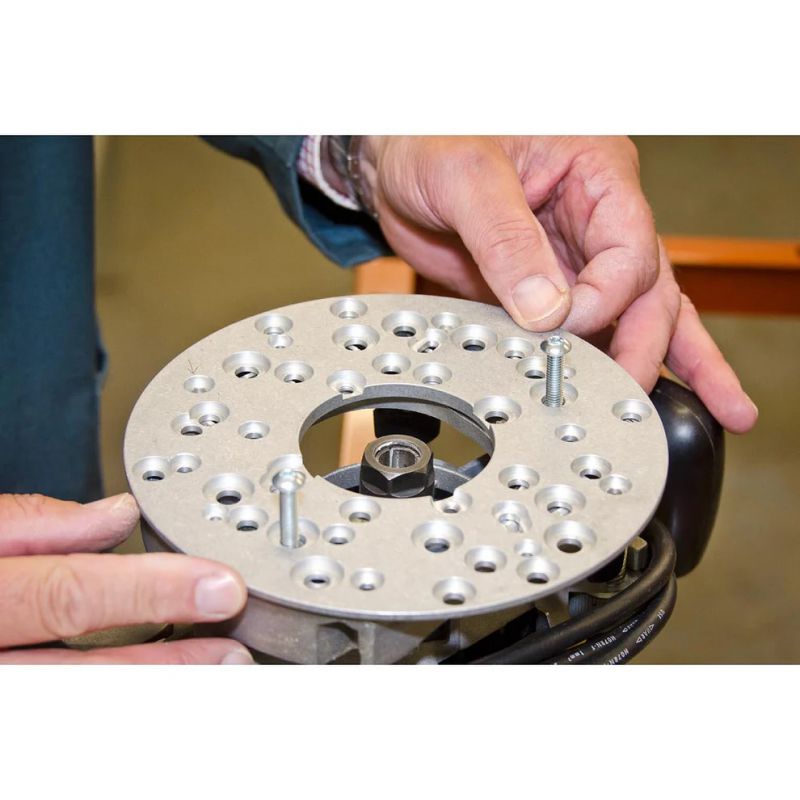 - This option is unusual in that it features a circular universal base attached to the underside of the plate with four machine screws. This base is pre-drilled to accommodate many different types of router and has a central hole of 64mm.