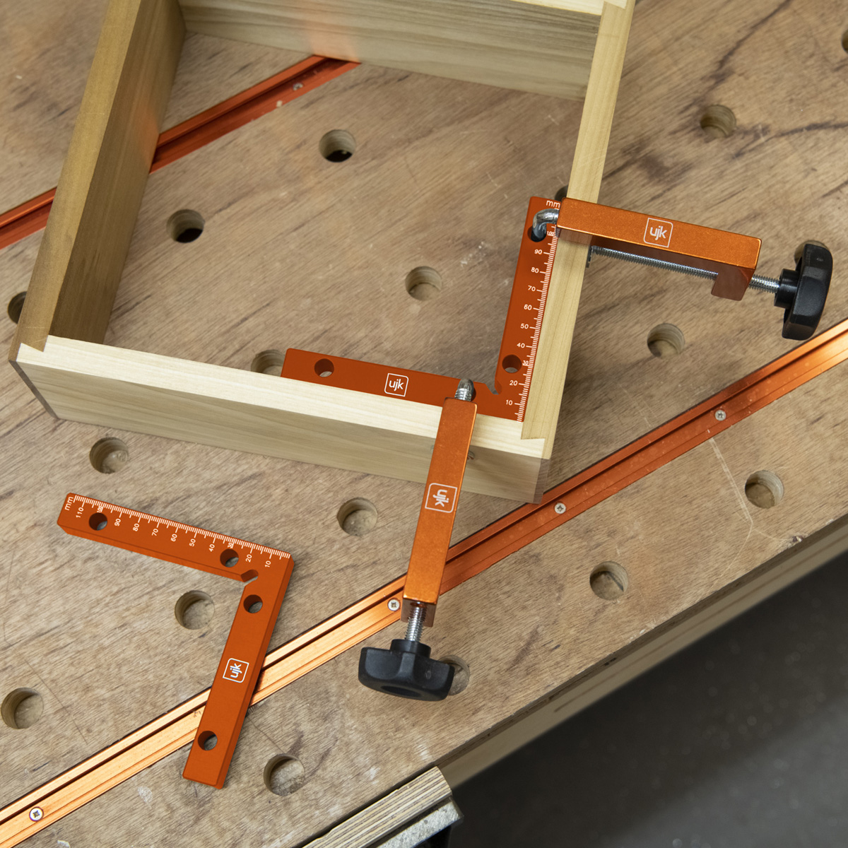 - The UJK Assembly Squares are indispensable tools that are the cornerstone for creating perfect right angles and ensuring your projects are squared and true. The UJK Assembly squares streamline your setup, ensuring saws, bandsaws, and fences are at precisely 90°. The graduated arm, marked in both metric and imperial, starts at the corner, doubling as a height gauge. Clamp them to secure drawer or box corners, on internal and external angles. The notched corner ensures full contact for accuracy, while the holes accommodate UJK Fence Clamps for a seamless clamping. British Made from high-quality aluminium, these squares are not only durable but also engineered for longevity, ease of use and versatility.