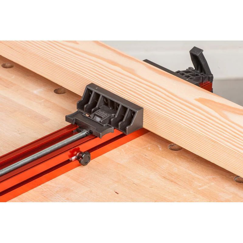 - The lower clamp grips your bench, while the upper clamp holds the workpiece.