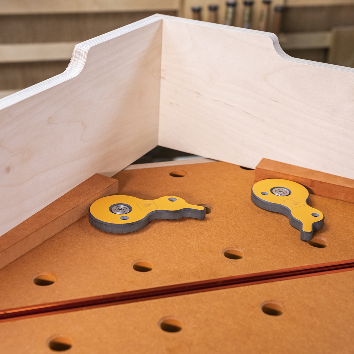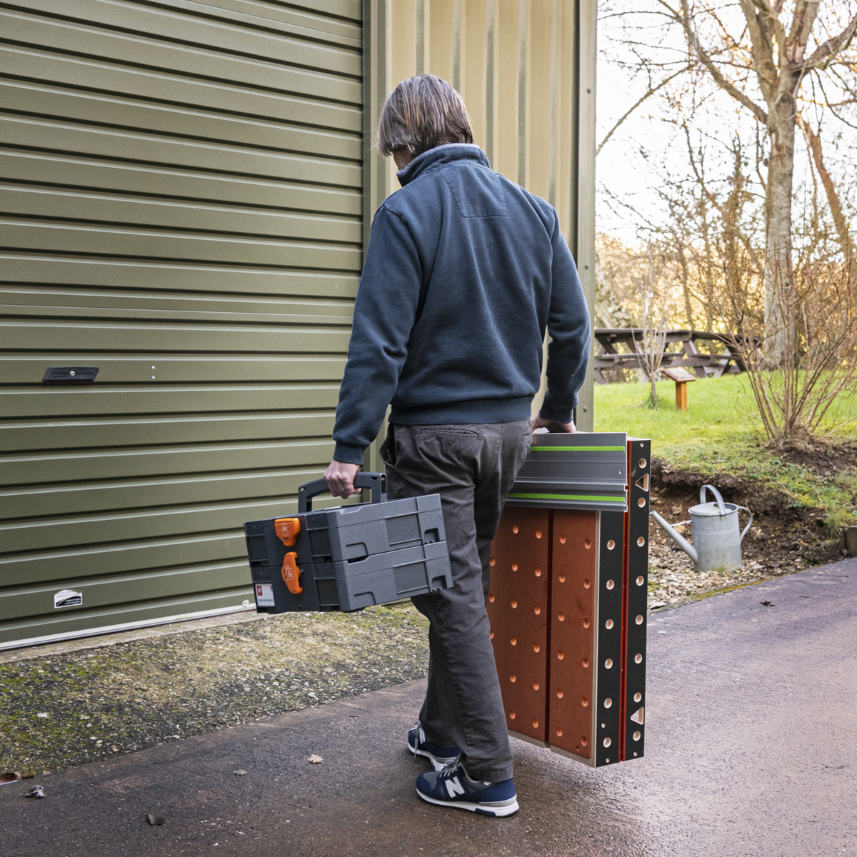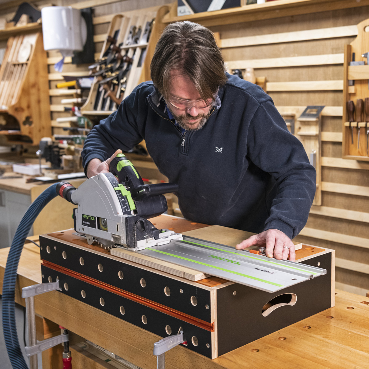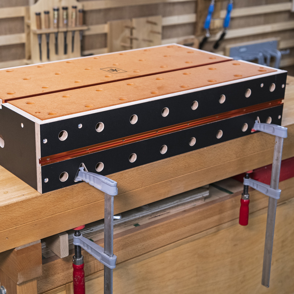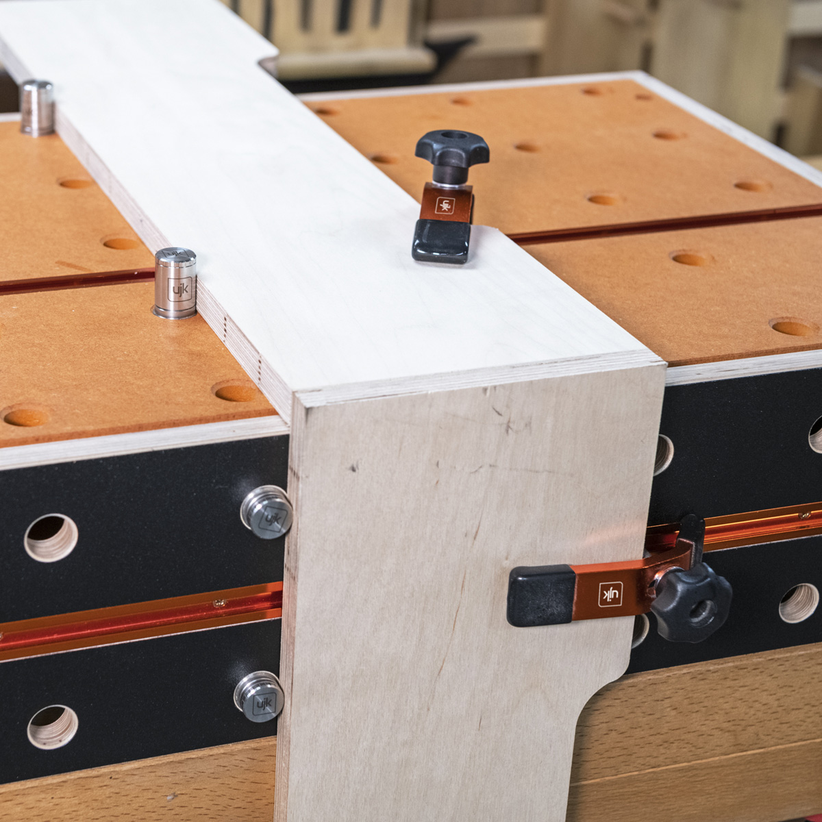 - This UJK Compact Multifunction Workbench gives you the advantages of the multifunction bench system in a compact, easily stored and transportable format. This compact version will be invaluable when working on site or in domestic situations without access to a full size bench. Use it as a mini workstation or small assembly bench. The top is 18mm thick Valchromat, the same material as used for the full size UJK Multifunction benches. It offers a generous work area of 750mm x 430mm. A grid of 20mm dog holes at 96mm centres allow you to make use of bench dogs, UJK Cam Clamps and other UJK accessories. In addition, a length of T-Track provides potential for various UJK hold downs and doubles as a 'going bar' when sawing. The outer frame is made from high quality laminated birch plywood, chosen for its strength and stability. It also features 20mm dog holes on the front face and a T-track for vertical clamping. Two clamp cut-outs allow temporary fixing to a bench top or table. The worktop is certified by the Pan European Forest Council (PEFC).