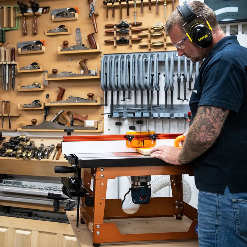 - The aperture in the table top is designed to accept the UJK router elevator and a range of other dedicated insert options.