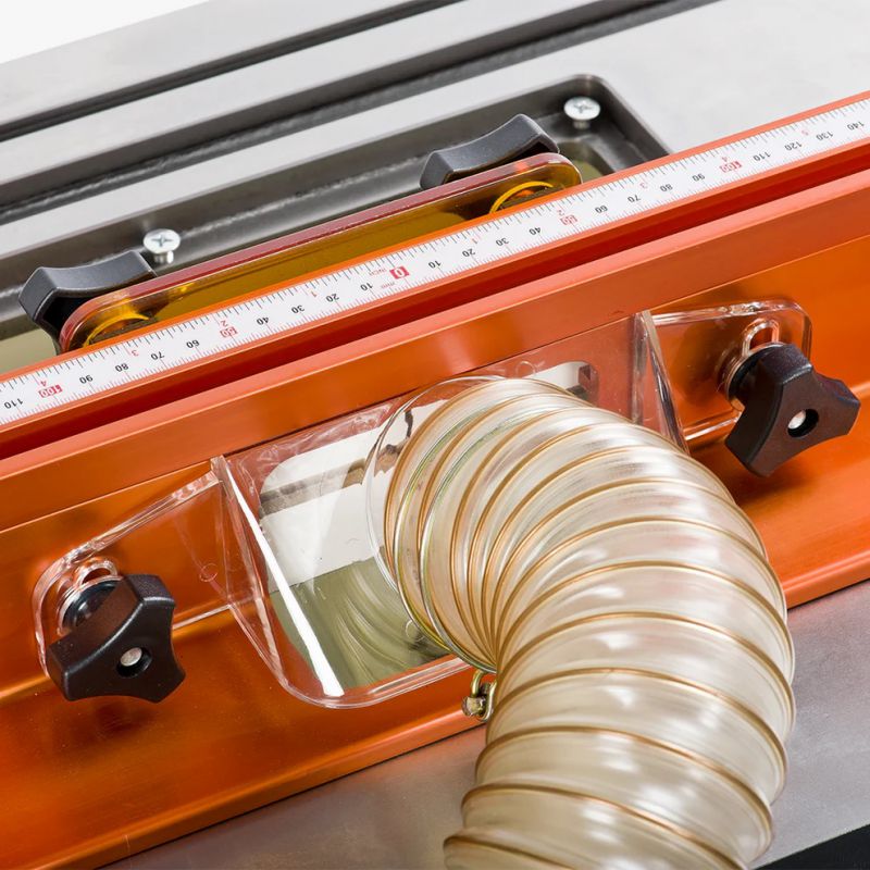 - The fence is a beautifully made, single piece aluminium section supplied with a transparent dust port for efficient extraction from above the table.