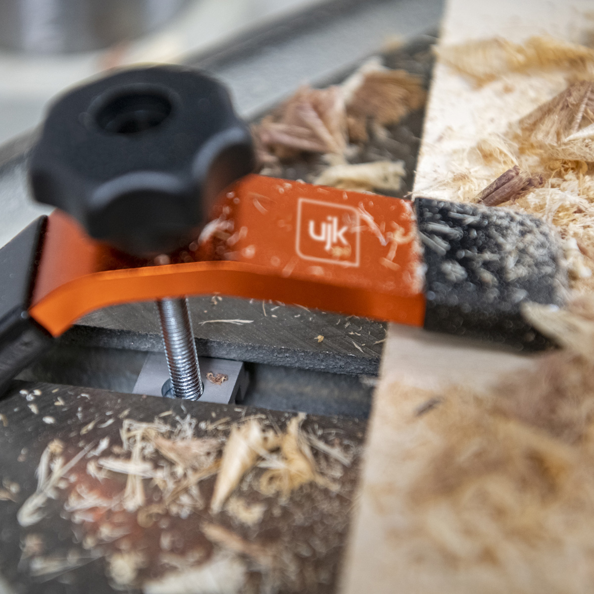 - UJK hold-down comes complete with an M8 x 75mm tee-bolt and an M8 through-threaded star knob. The tee-bolt is compatible with the UJK T-Track allowing you to use these hold-downs in a variety of situations. Also features an aluminium stepped track adaptor for use in mitre slot tracks. Fits UJK T-Track and all standard mitre slot track.
