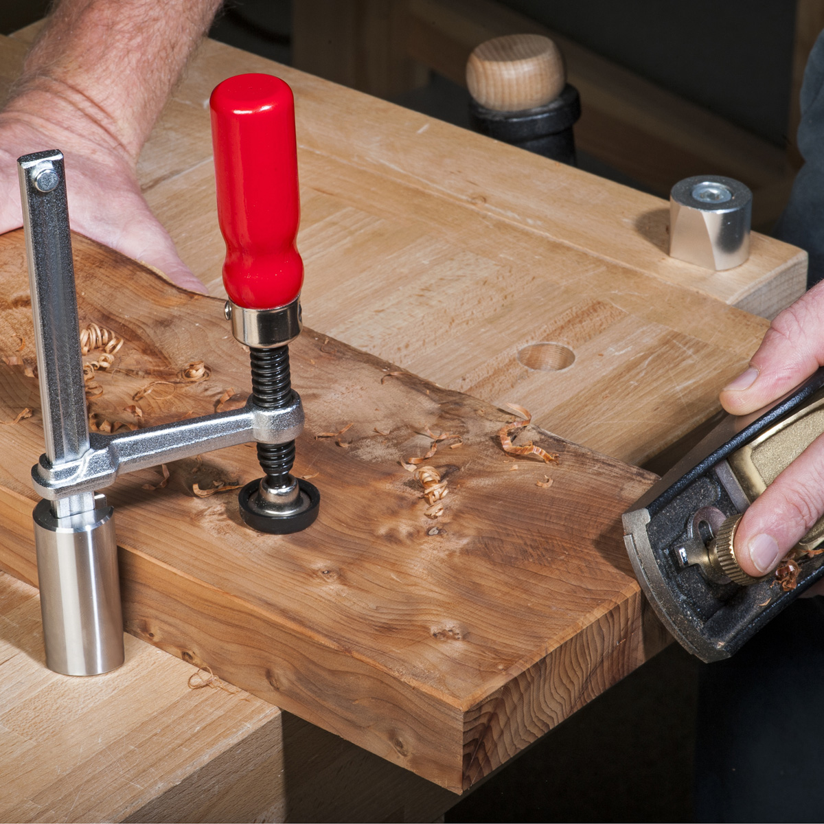 - The hold down clamp is a real bonus when you are setting up work on the vertical face of a UJK workbench. With a Twist or bench dog in one hole and the clamp directly above, you won’t need a second pair of hands.