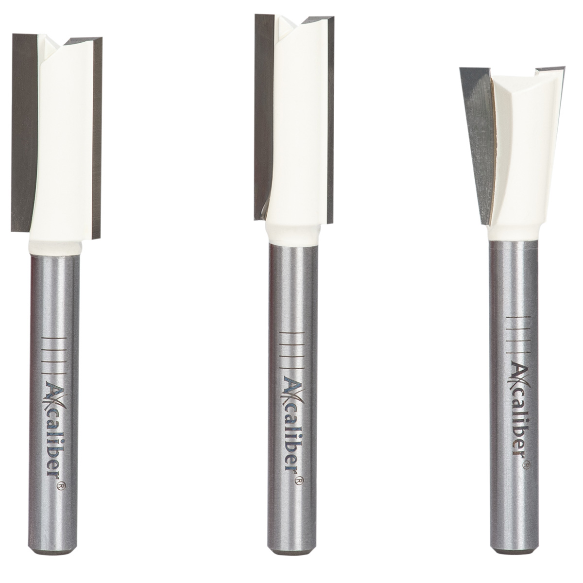 - Supplied with three 1/4" shank Axcaliber precision ground TCT router cutters; A matched pair for dovetailing (7 degree dovetail and straight) and a 12.5mm straight cutter.