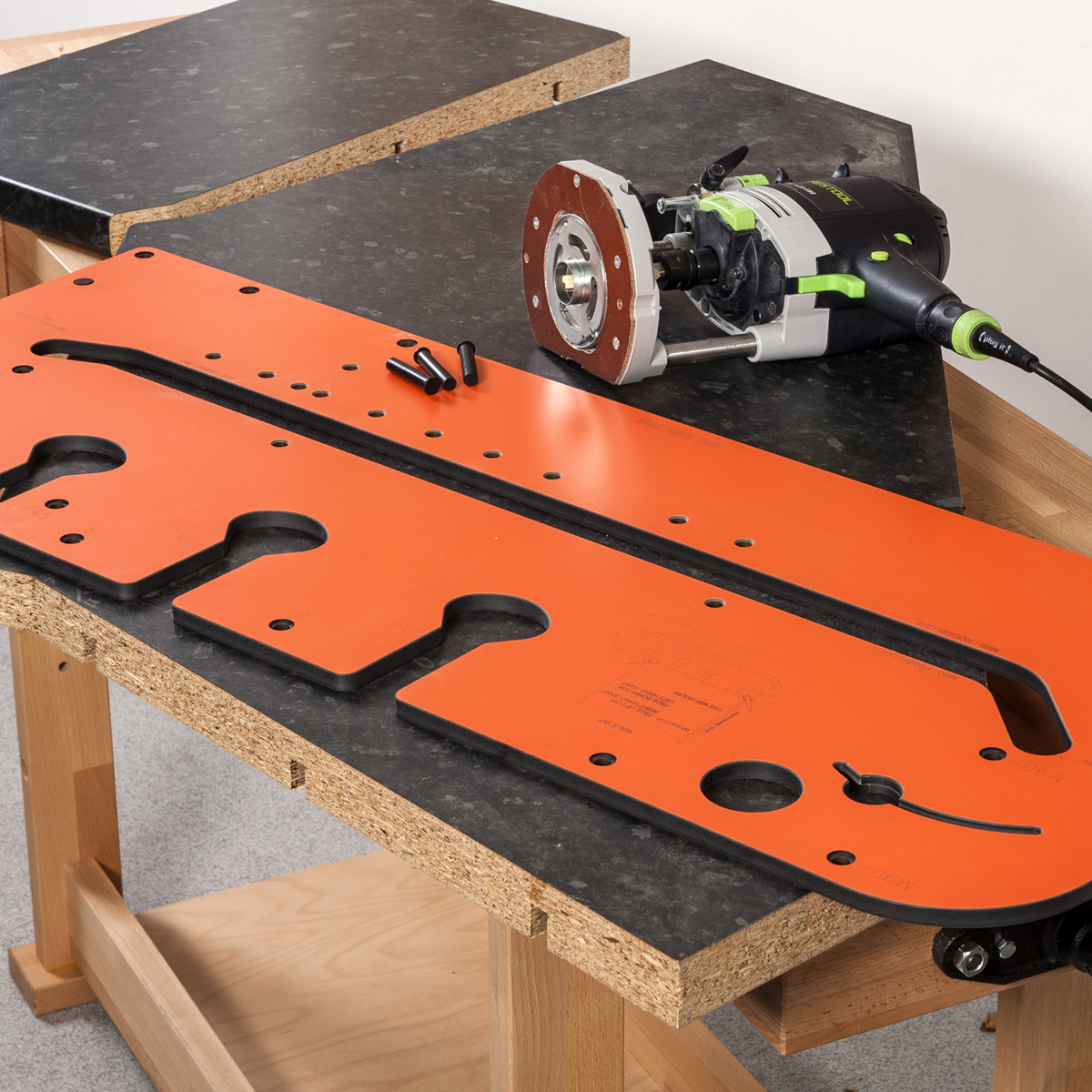 - There is also an extra hole for 635mm width of worktops included in the jig. The jig is CNC cut from 12mm thick solid compact phenolic resin which is very stable and doesn't warp.