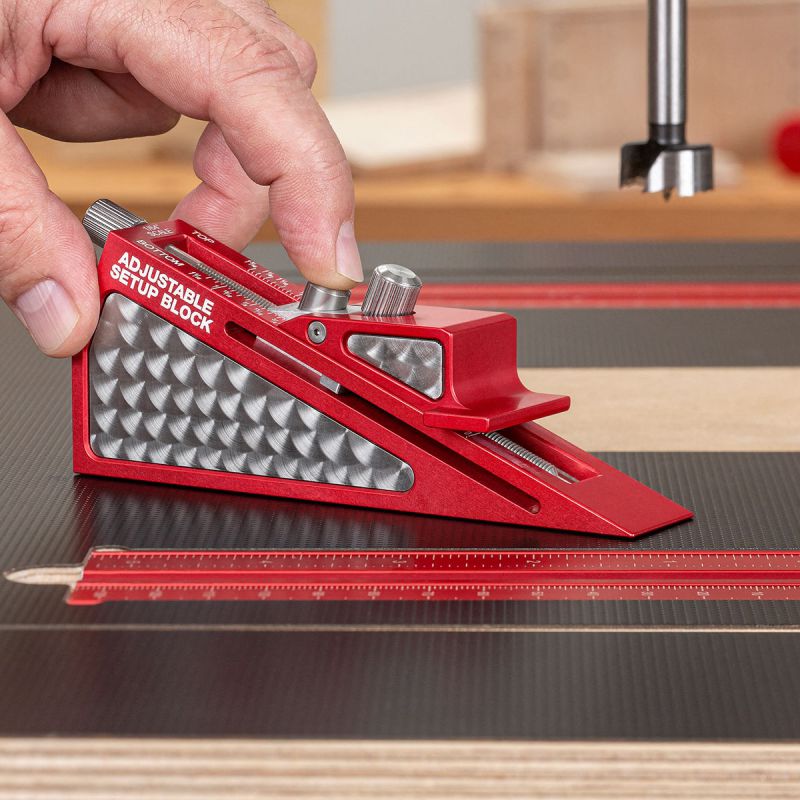 - Quick Adjustment and Locked-in Precision. It’s just three steps to your precise dimension with the Adjustable Setup Block. Depress the quick-adjust button and slide the reference surface up or down until it’s close. Use the micro-adjust to dial in your exact dimension, then tighten the locking knob. It’s that easy.