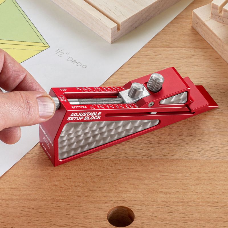- A physical reference representing your critical dimension leads to more accurate machine set-ups than trying to adjust to a scale. Lots of woodworkers use sets of blocks for this task, but Woodpeckers Adjustable Setup Block, is one single device that adjusts to any dimension between 1/64" to 1-3/16". Just use the easy-to-read scale to position the reference surface and dial in your cutter height or fence position. Use your sense of sight and touch to deliver the perfect settings.