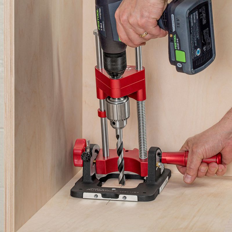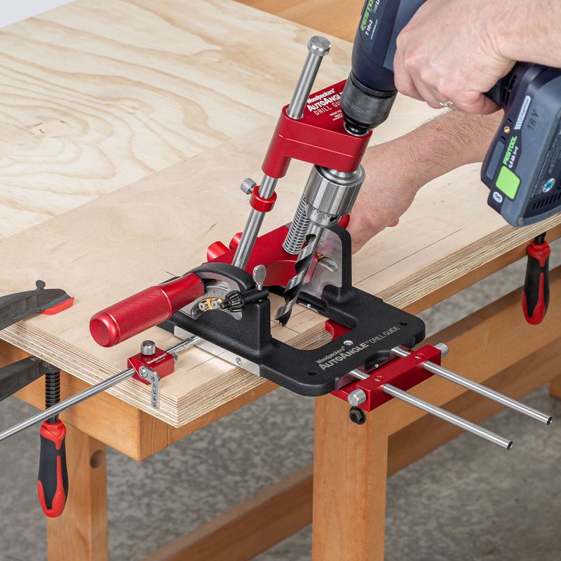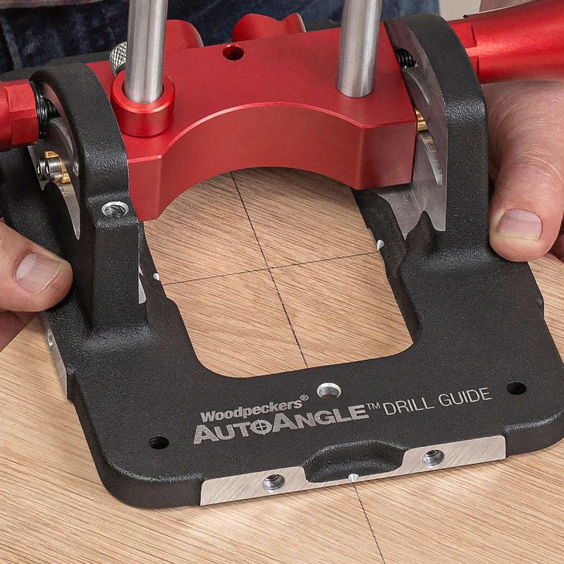 - There are several challenges when drilling angled holes. First is getting the angle correct, next is getting the direction of angle correct, and perhaps most important, you have to get the entry point correct. It’s tough enough doing it on a drill press, but when you have to do it in the field or on a large workpiece, the challenges get…more challenging. Woodpeckers new AutoAngle Drill Guide marries the best features of our AutoLine Drill Guide to a clever protractor base that makes it amazingly simple to set up your drilling angle and hole location. If you can layout a crosshair on your material, you can put a hole through that crosshair at any angle you choose from straight up and down to a 40° angle.