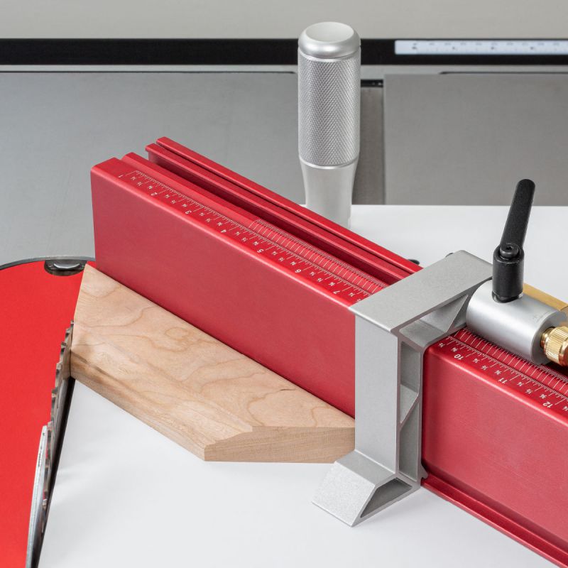 • To complement the dialed-in accuracy of the protractor, the micro-adjustable flip-stop has a section that nests back into the face of the fence. This prevents sharp mitered ends from lifting the stop out of position.