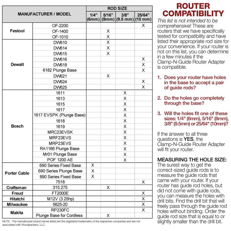 - We make the Clamp-N-Guide in two sizes, 24" and 48" clamping capacity. The Router Adapter is available with 4 different guide rod sizes, 1/4", 5/16", 3/8" and 10mm. There's a chart in the extra images that shows you the right sized guide rods for many popular routers and how to measure the holes in your router base if it's not on the list.