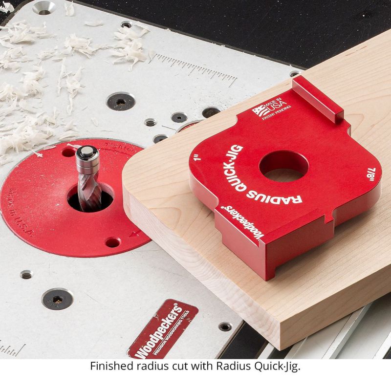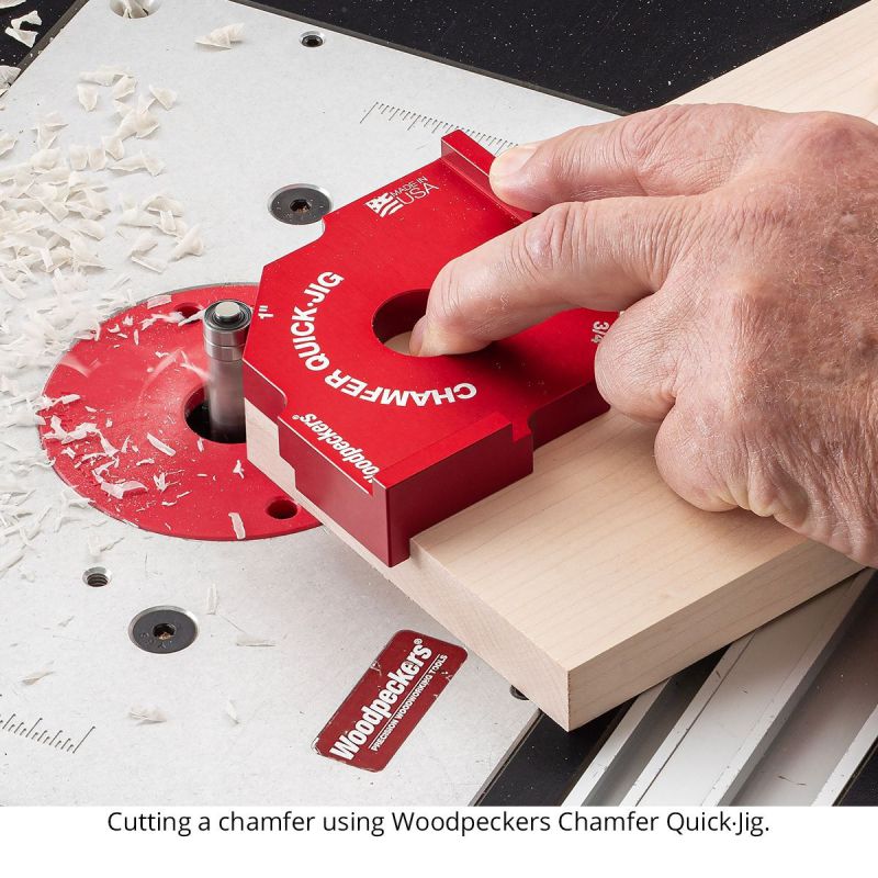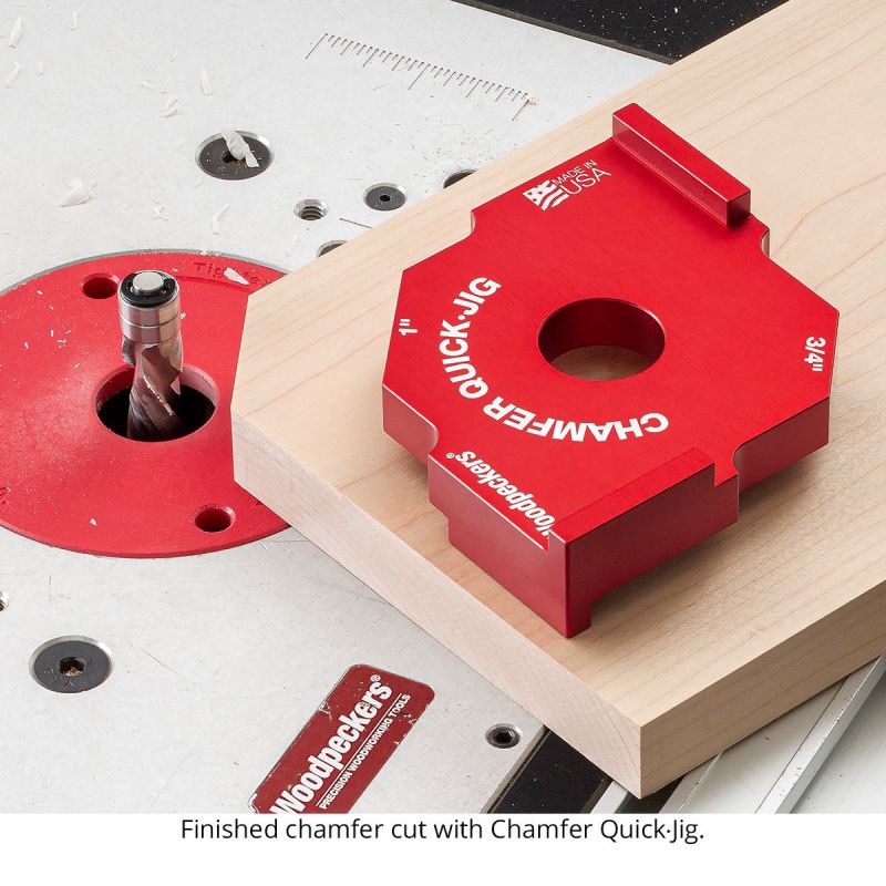 - With Woodpeckers Chamfer and Radius Quick-Jigs you can forget your jig saw and belt sander routine to soften the corners of your projects. Instead, accurately create clean, precise chamfered or radiused corners in seconds using your router table. Projects look fully finished with the corners softened. Sometimes you want a little, sometimes you want a lot, but you always want “some". These jigs handle the job effortlessly.