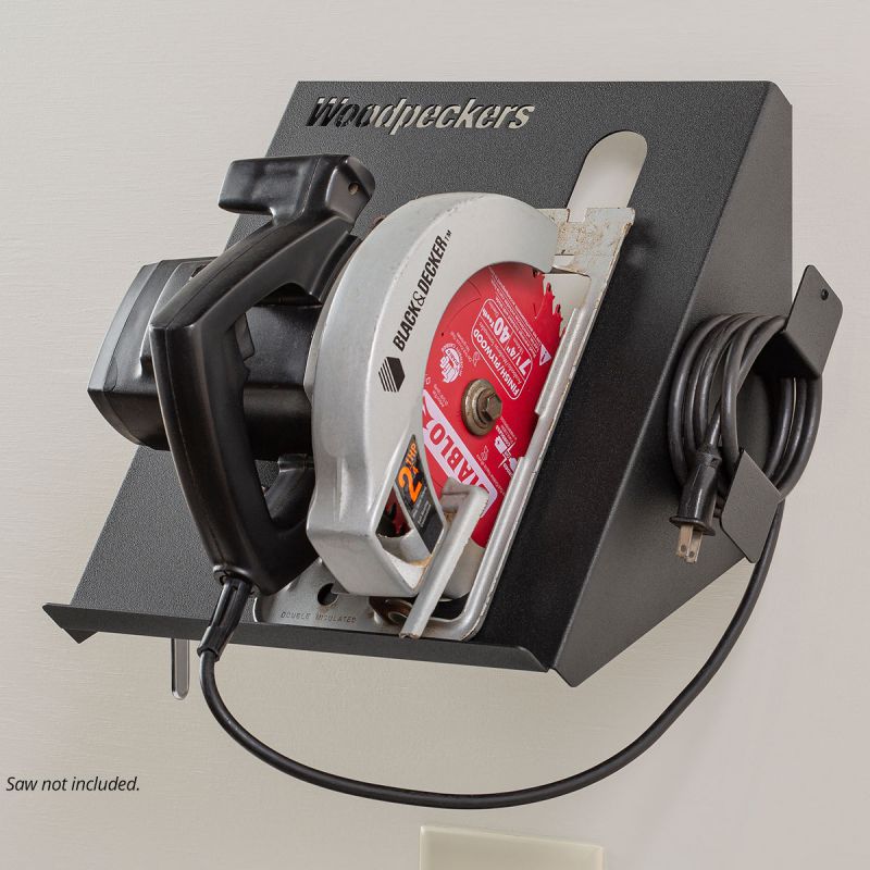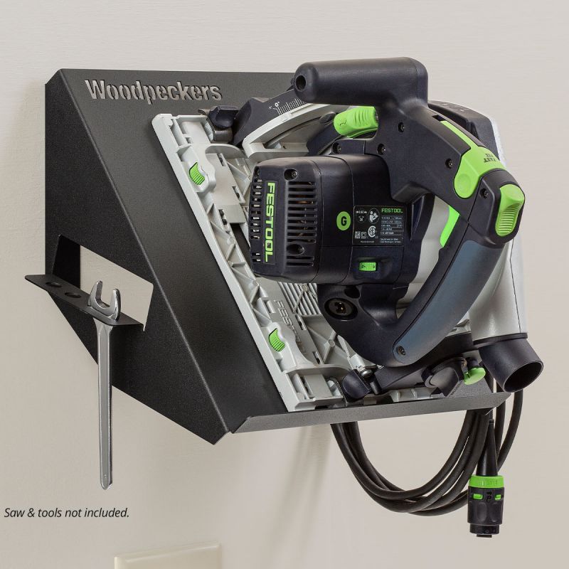 • Woodpeckers Circular Saw Rack-It mounts to your wall and keeps your saw right in plain sight and ready for the next project…no more digging through cabinets and tool boxes to find it. The shelf accommodates both plunge-type track saws and traditional circular saws with retractable blade guards. One side of the Rack-It features slots for arbor wrenches and other frequently needed tools while the other side has built-in cord storage.