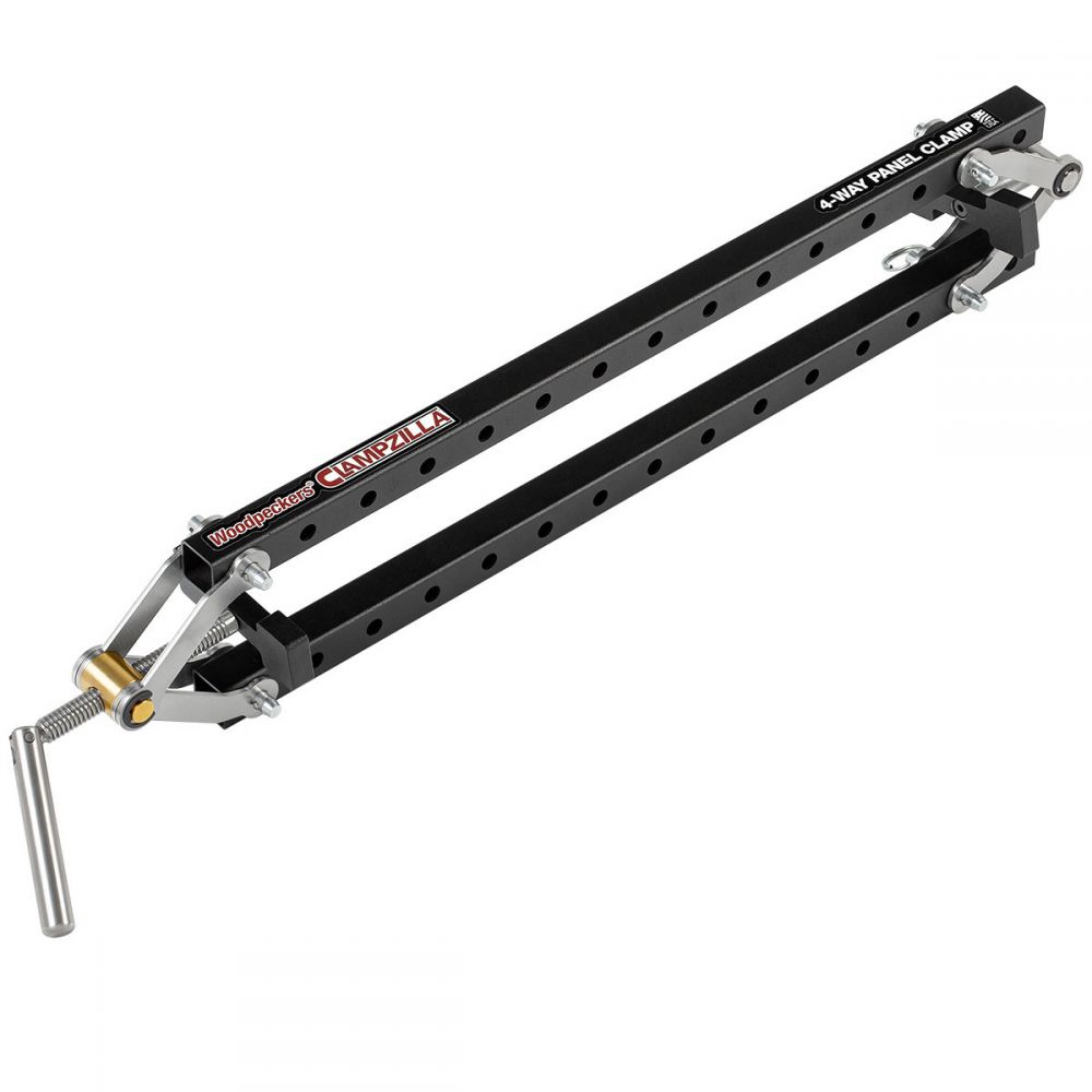 • ClampZILLA now comes in 3 sizes; 18", 38" and 50" capacity. The 50" bars are quite heavy and long, so we also sell them separately so you can replace the bars in either the 18" or 38" clamps only when you need the extra length. Older ClampZILLA 4-way Panel Clamps can be upgraded with the new scissor joints, nearly doubling the vertical clamping force. Upgrade kit includes everything you need to convert your old ClampZILLAs. If you need storage for your ClampZILLAs, you can fit up to four of them in one of Woodpeckers Clamp Rack-Its (sold separately) and have them put away as fast as you can drive two lag bolts.