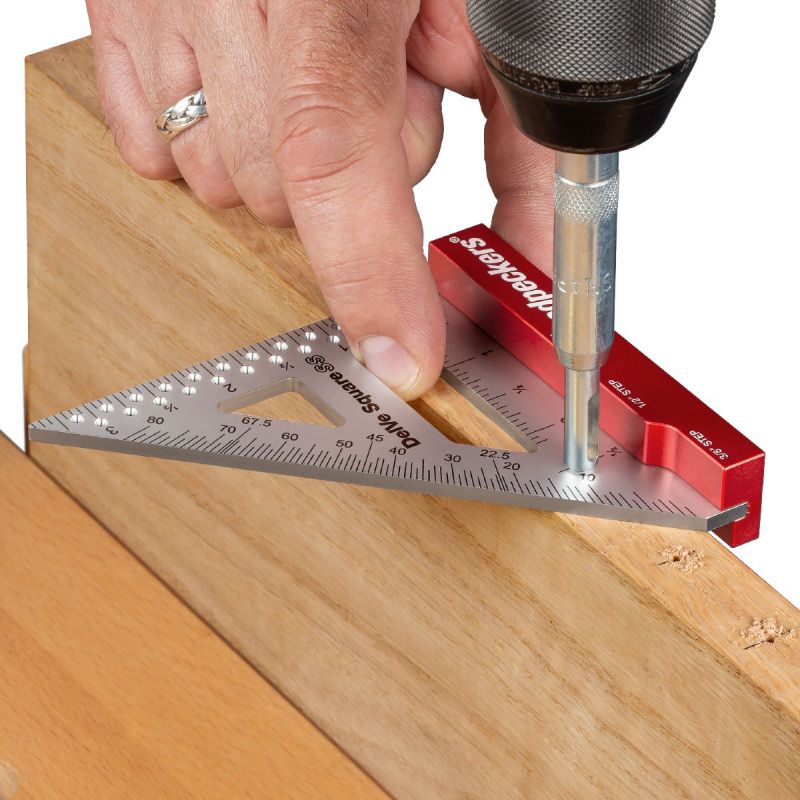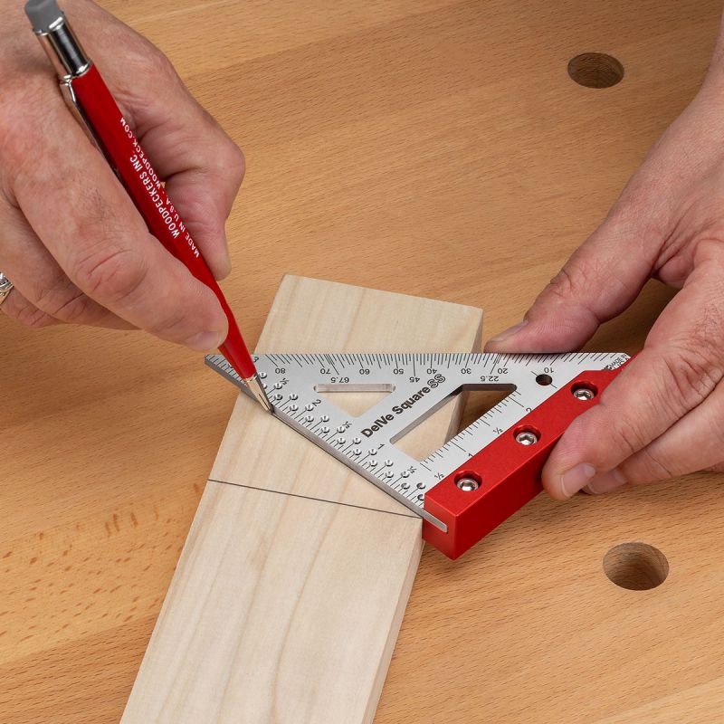 - Scales on the blades are engraved to an accuracy of ±0.004" total accumulated error. To make accurate layout even easier, there are scribing guides milled every eighth-inch along the blade. Just drop the tip of your pencil in the right hole and slide the base along the edge of your stock for perfectly parallel lines at the precise measurement you choose. To lay out angles, the hypotenuse is engraved in 1° increments with 22-1/2° and 67-1/2° markings added for octagonal lay out.