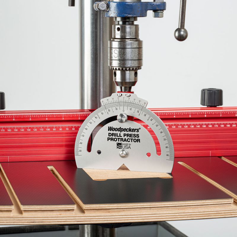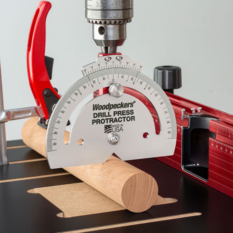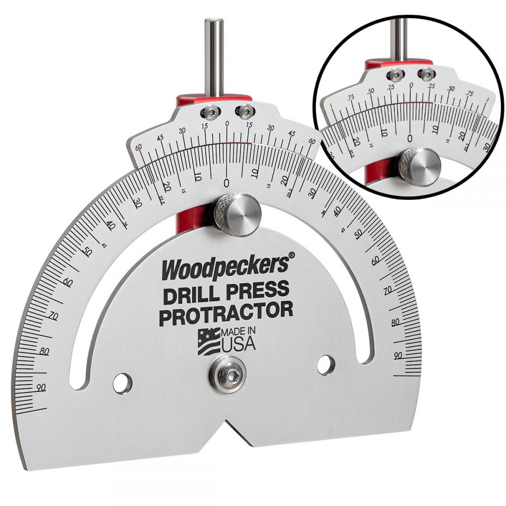 - Woodpeckers introduces the Drill Press Protractor…a deceptively simple tool that delivers a high level of accuracy when setting angles on your drill press and other critical tools in your shop. It's a big step for a woodworker to walk away from straight and square and start incorporating angles in joinery and design. Setting angles accurately on tools and jigs represents a huge part of the challenge. The Drill Press Protractor uses a vernier scale to let you set an angle as precisely as 5 minutes of a degree while reading engraved lines that are widely spaced and easy to see. Once you have your angle set, just mount the Drill Press Protractor in your chuck and adjust the table to match. Whether you're tackling splayed leg chairs and stools or adding a mid-century modern look to a coffee table or credenza, the Drill Press Protractor makes sure your angles are spot on.