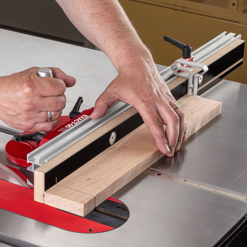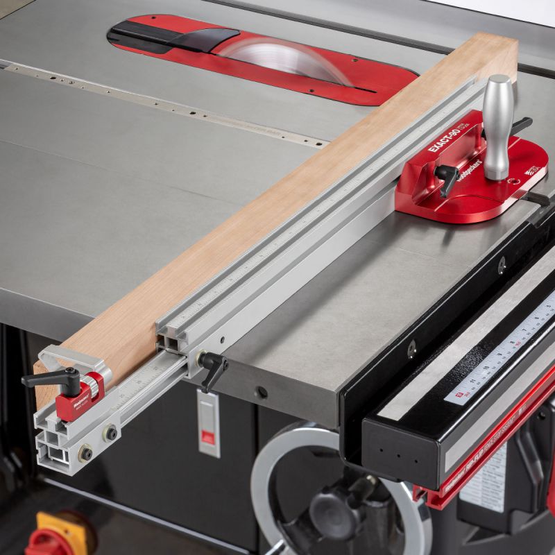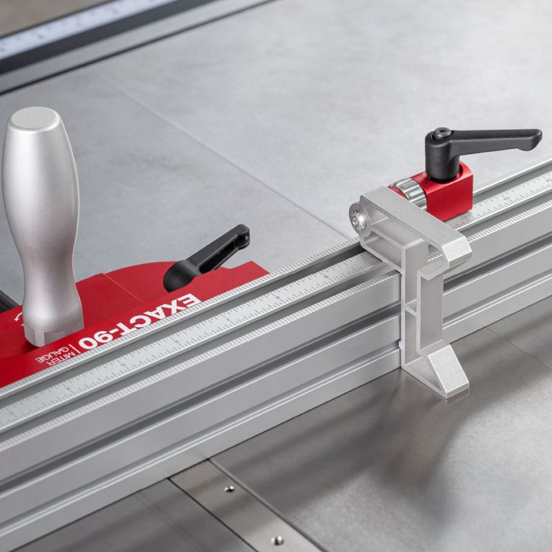 - Perfectly square is great, but accurately controlling the length of your stock is critical, too. The Exact-90 includes a newly designed fence with an easy-to-read scale right on top. The fence houses an extension that slides out to take the flip stop all the way to 45 inches. Speaking of the flip stop, its new design lets you dial in the position of the flag with finger-tip control…no tapping or nudging. And, none of the adjustments on the fence, flip stop or extension require a tool…no more searching for lost Allen wrenches. Also, there’s a sacrificial fence which can be used to reduce tear-out and fully support your material all the way through the blade.