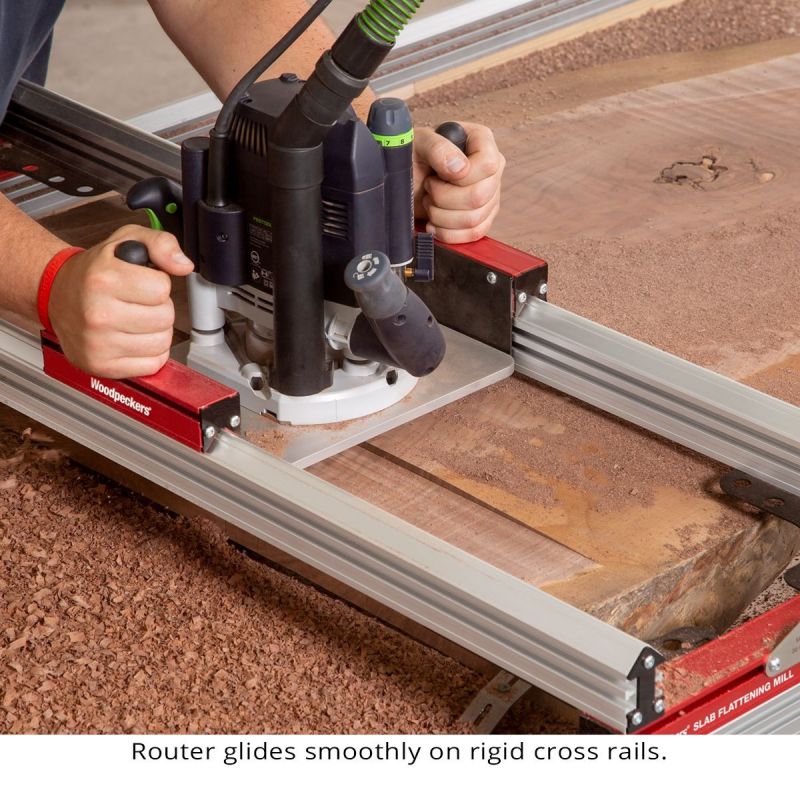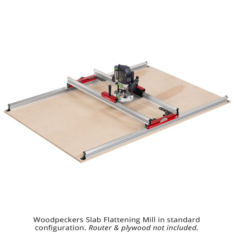 - Woodpeckers Slab Flattening Mill guides your router over your slab in a controlled plane. Since you’re using a router instead of a planer-style cutterhead, tear-out is minimal…the surface will only need light sanding afterwards. The Slab Flattening Mill starts with two aluminum extrusions. The inverted “V” shape of these main rails sheds sawdust and provides a solid base for the mating extrusion. The second extrusion fits over the inverted “V” and glides on UHMW polyethylene runners. Simply mount the mill to any flat and level work surface…even a sheet of MDF on a pair of sawhorses. When you’re done, the modular design stores conveniently.