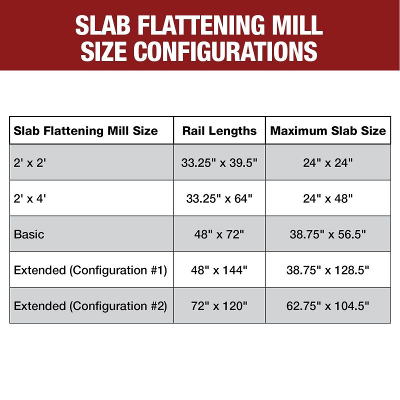 - We now offer the Slab Flattening Mill in 3 sizes to accommodate the needs of every slab woodworker. If you’re tight on shop space and are planning to do end-grain cutting boards and end-table-sized slabs, our smallest Slab Flattening Mill will handle work up to 24" x 48". The Basic Slab Flattening Mill accommodates slabs up to 38” x 57”. The Extended Slab Flattening Mill adds an additional pair of 72" rails that can either replace the cross rails to increase width, or connect with the base rails to extend length. The capacity grows to either 62” x 105” or 38” x 129”. These huge capacities are great…when you need them. Remember, though, you can always mount the rails closer together when it suits your project. See the chart in the photos for a guide to all the maximum size configurations. All sizes of the Slab Flattening Mill can accommodate stock up to 3-7/16" in thickness. If your stock is thicker than that, you can use shop-made spacers to raise the Slab Flattening Mill. Conversely, if you are dealing with thin stock, you can use the same approach on the underside of your thin stock. Since all routers vary in height capacity and router bits vary in overall length, you may need to elevate your stock or elevate the mill in order to achieve the desired results of the Slab Flattening Mill.