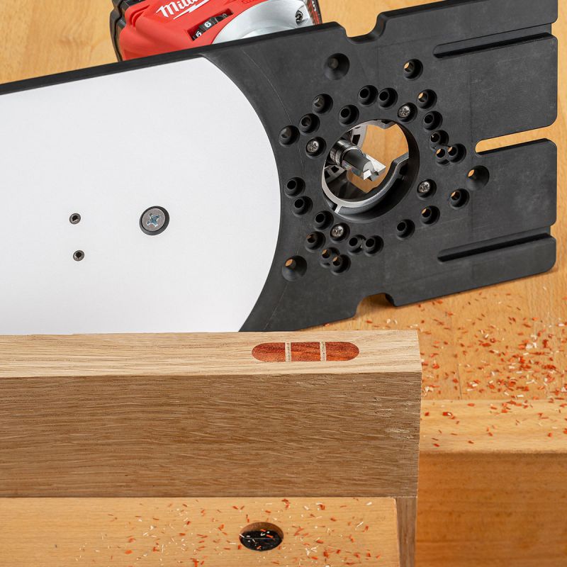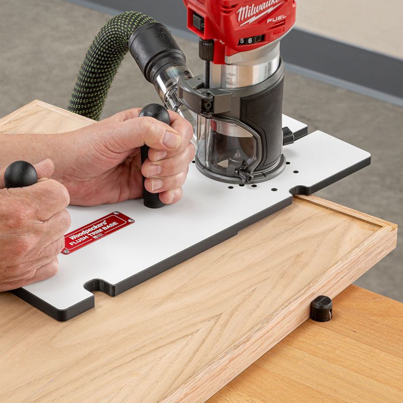 - Woodpeckers new Flush Trim Base streamlines the process of trimming solid wood edge banding. A block plane is great…if you have one, know how to sharpen it, and have a great deal of time on your hands. Balancing a router with a flush trim bit on the edge is faster than a block plane, but that's like walking a tight-rope…one slip away from disaster. The Flush Trim Base starts with of a 6" x 15" solid phenolic plate. Over half the base provides a reference surface for the top of your panel. Where the router mounts, the phenolic has been machined to create a relieved area that will clear anything 1/8" above the panel face. Just dial in the router bit to be a few thousandths above the surface of your plywood and you're ready to shave edge banding (or anything else, for that matter) in line with the plywood face. With the router oriented vertically, chip-out is virtually eliminated. And with three different ways to guide the cut, there's no edge banding project you can't tackle. The Flush Trim Base is drilled for most major brands of cordless and corded trim routers. It also fits 1-1/2 hp routers with the standard Porter-Cable three-screw base plate. See the complete list in the "Specifications" tab.