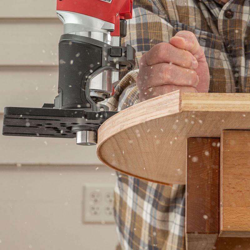- Trim edge banding all the way around a panel all at once by working without the fence. With a router bit wider than your edge-banding, there's no problem staying aligned to your cut. Just keep downward pressure on the hand-grips and guide the Flush Trim Base around the corners.