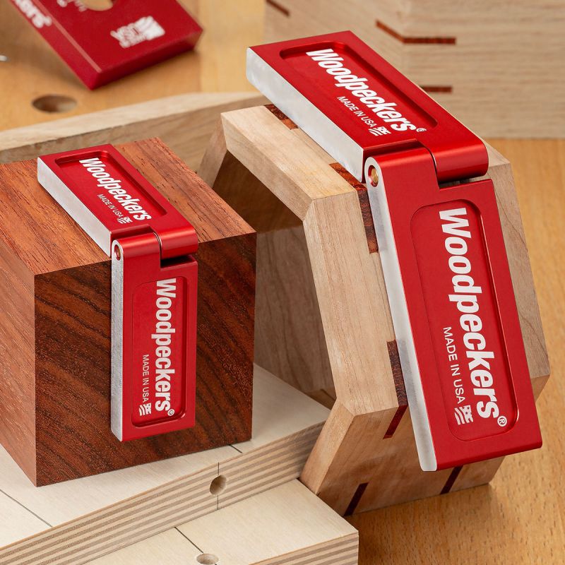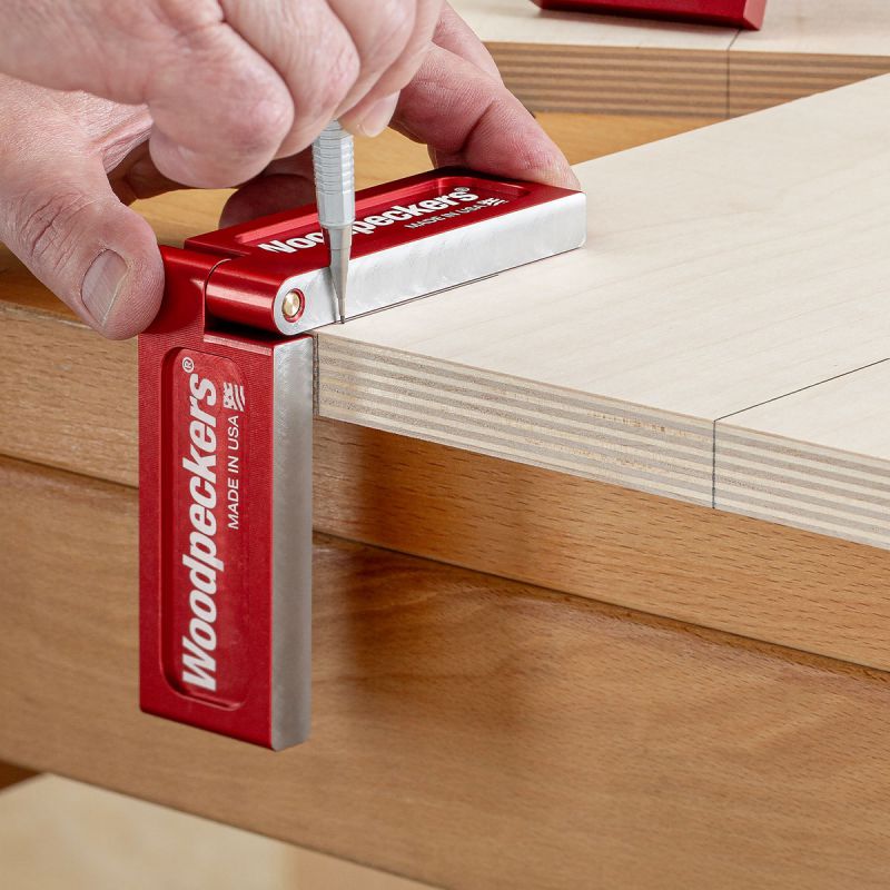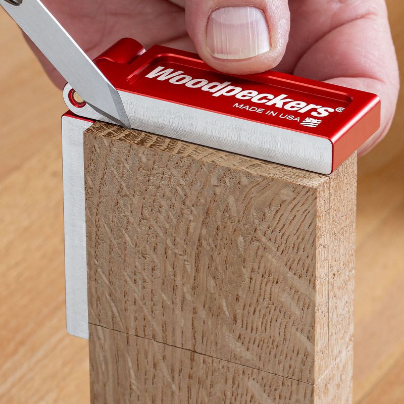 - Woodpeckers introduces the new Folding Saddle Squares…tools designed for flawless joinery layout. Transferring a layout line around a corner with traditional layout tools calls for patience, dexterity, keen eyesight and…let's face it…luck. Even if you're off just half the width of your pencil lead, by the time you carry the layout all the way through and make your cuts, that tiny error could balloon into a poor-fitting joint. Think of the Folding Saddle Squares as straightedges that happen to have a hinge right in the middle…because that's exactly how we make them. The edges are milled after final assembly. That's right. After the parts are machined, anodized, laser engraved and fully assembled, they head back out to the machine shop where both edges get one more pass on the CNC mill, cutting both halves perfectly in plane with each other. They will stay in plane, too, because the hinge is tensioned to eliminate lateral play while still allowing silky smooth angle adjustment. You get a precision straightedge that will wrap itself around a corner.
