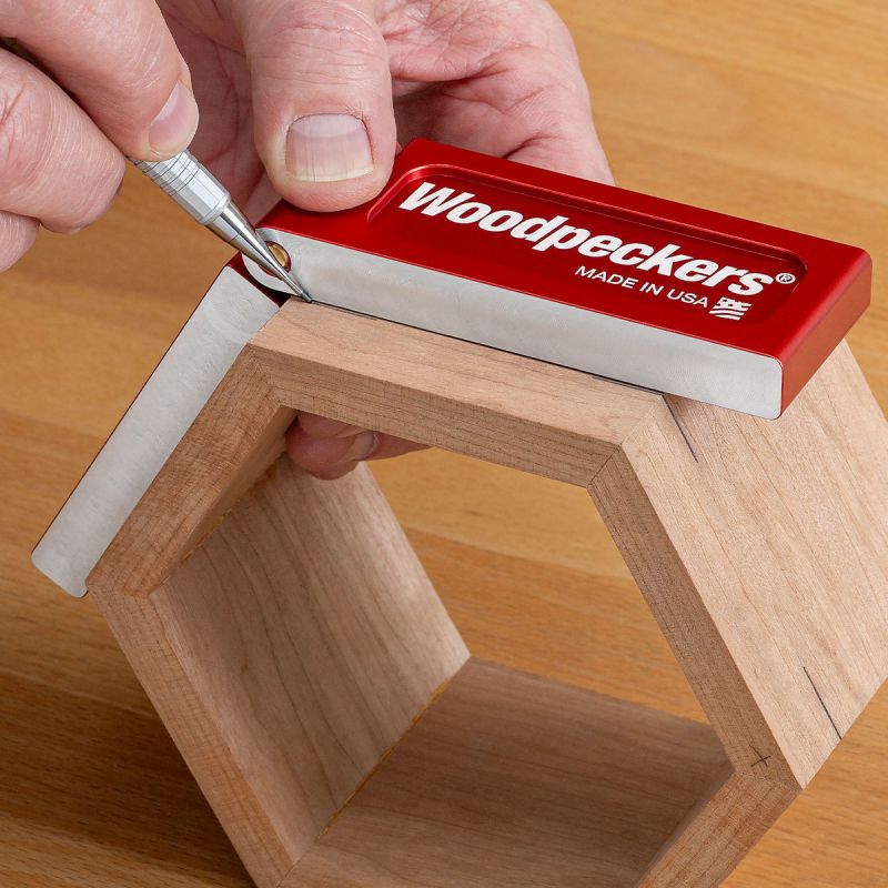 - So far, we've looked at square corners…but the Folding Saddle Square works just as well on angles larger than 90°. Lay out spline locations on hexagonal and octagonal boxes. Lay out angled bridle joints in table and chair construction. Carry layout lines around corners in multi-sided rooms. Anywhere you need to mark the same dimension on two adjacent faces, the Folding Saddle Squares will get the job done.