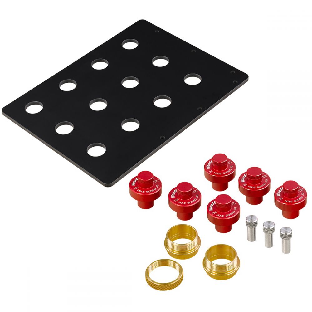 - Two standards have developed for these table tops. Festool and several other European-based companies use 20mm holes. Veritas and several others use 3/4" holes. Woodpeckers has you covered no matter which standard you use. You can get the Hole Boring Jig with the right guide bushings and index pins to cut either 20mm or 3/4" holes. Or, if you have “some of this and some of that,” get the complete kit which has the guide bushings and index pins for both sizes.