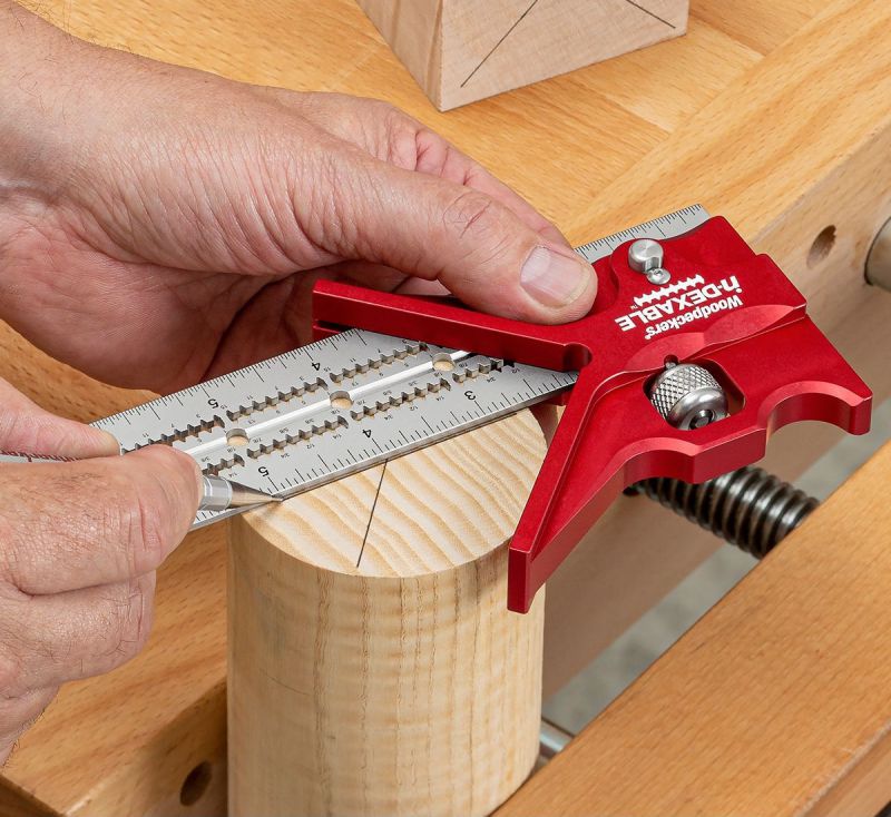 Centering Head: Find the Center of any Round or Square Stock. The Centering Head holds the blade at a 45° angle relative to machined 90° surfaces. Marking the two diagonals of a square locates center. It’s even easier to find the center of a circle…just hold the Centering Head against the circle in any two different spots and strike a line across the diameter. The intersection is the dead-center of your circle. Opposite the 90° centering guides, the back side of the Centering Head locks in with the indexing feature so you can scribe without changing heads.
