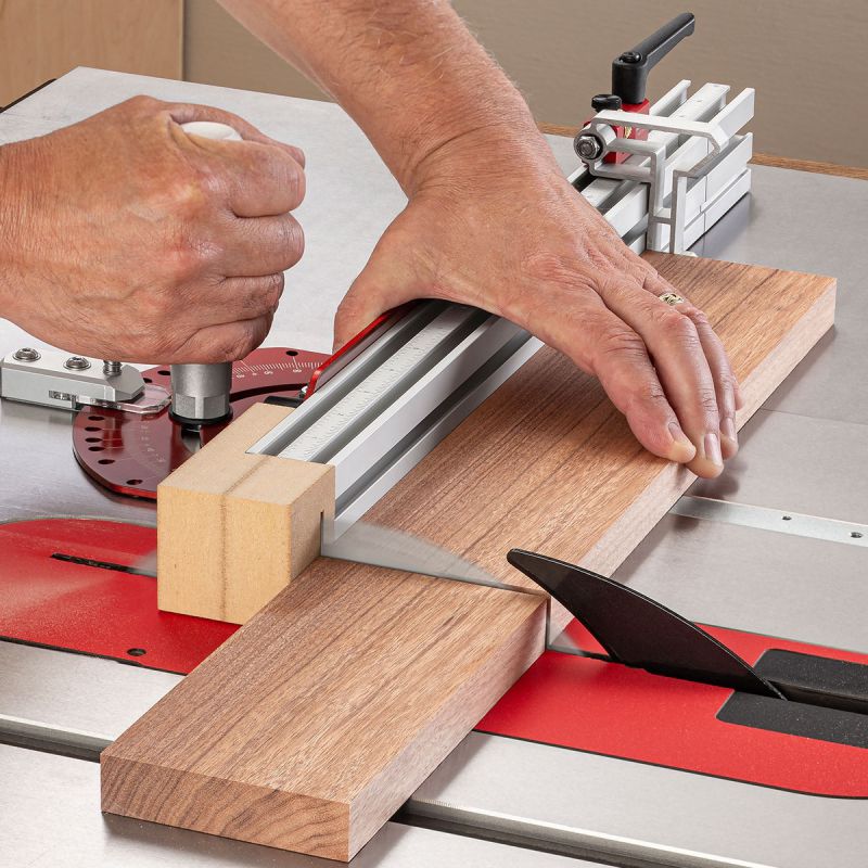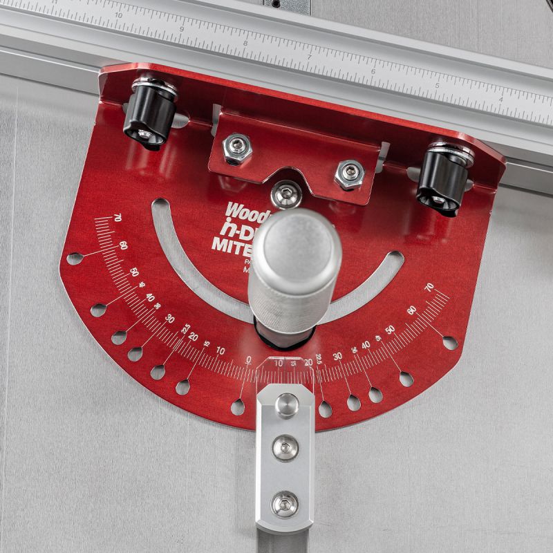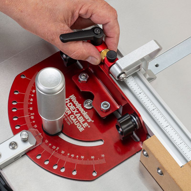 - Woodpeckers new in-DEXABLE Miter Gauge draws features from both our StealthStop and Exact90 miter gauges and adds a few new touches to create a fully-featured replacement miter gauge at an unbeatable price. It starts with our patented miter bar. Leaf springs in the edge compensate for poorly machined or time-worn miter slots. The protractor head has precision-machined indexing holes for the miter angles of common polygons. For other angles a new hairline reticle makes it easy to set the head accurately. The graduations on the fence line up perfectly with the all-new, tool-free, micro-adjustable flip-stop. And the extension bar is graduated, too, giving you an exact measurement to the stop. The fence ends with a sacrificial block that eliminates tear-out and directs off-cuts away from the blade. There are other great features (details below), but just from this highlight list you can see this is a giant step forward from any factory miter gauge, yet it's priced attractively when compared to others on the market.