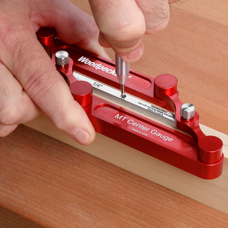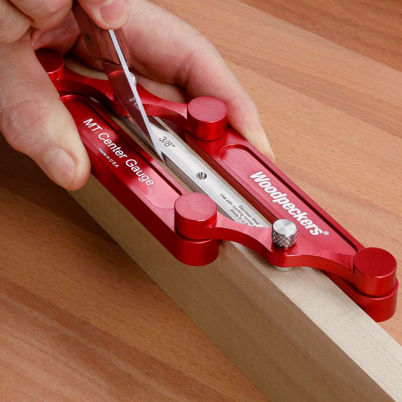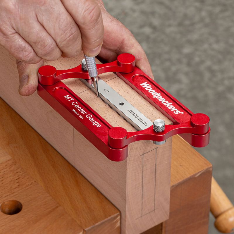 - The MT Center Gauge eliminates the guesswork from precisely centering mortise and tenon joints. The precision-machined parallel arms quickly adjust to the stock thickness, placing the marking bar right in the middle. Just scribe each side of the bar and you’re done. Each marking bar is precision-machined from stainless steel (ideal for working with marking knives), and each has a pencil guide at its exact center. The parallel arms open to accommodate stock up to 2" thick.