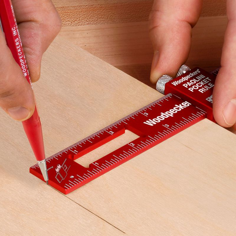 - Two material choices and three graduation options. The bright white laser engraved scales on the “Woodpecker Red” anodized surface make the original aluminum Paolini Pocket Rule one of the easiest-to-read rules on the market, as well as one of the lightest. If you prefer a thinner rule, go for the stainless steel version. Both are milled to a precise 1-inch width. The anodized aluminum rule is 1/8" thick and the stainless model is 1/16" thick. Both are available with your choice of inch-only, metric-only or inch-metric combo scales. Regardless of the material or graduation choice you make, you’ll love the clean, precise look of our state-of-the-art laser engraving, as will generations of woodworkers to come.