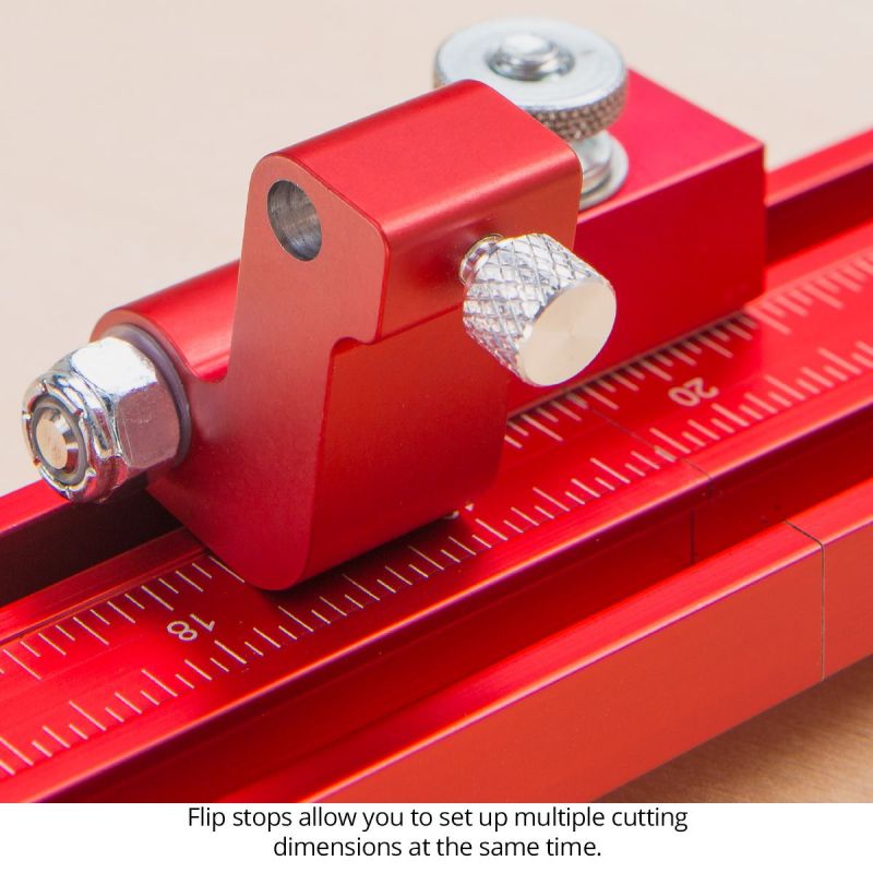 - Four (4) Flip Stops (two on each track lets you cut at two dimensions without resetting).