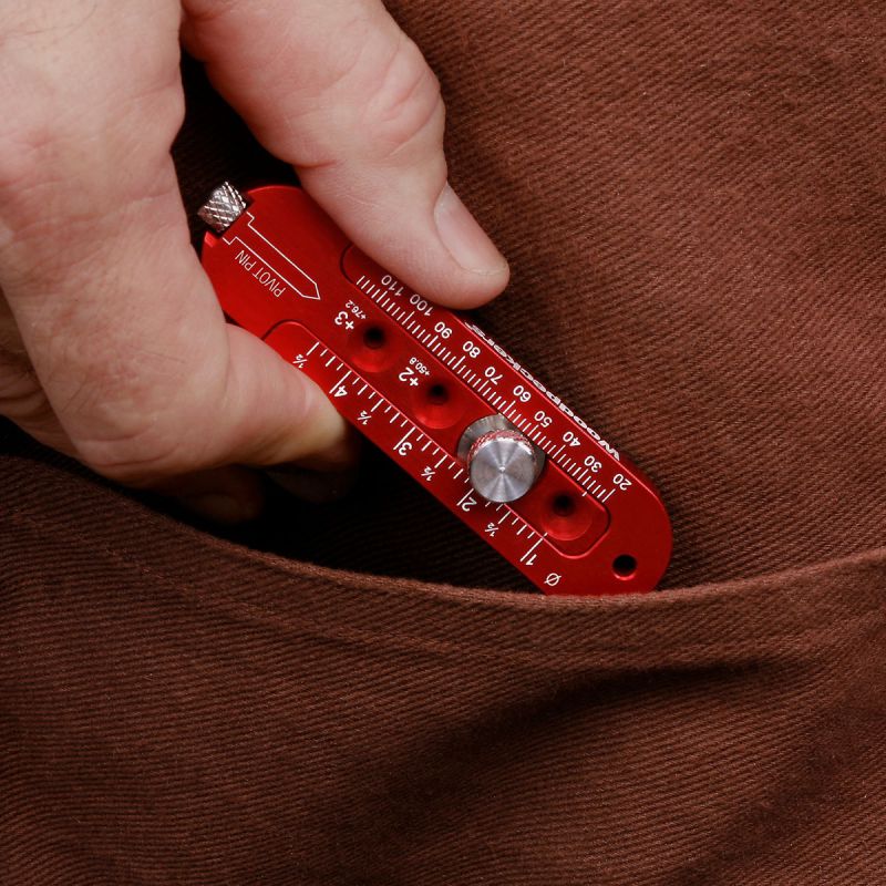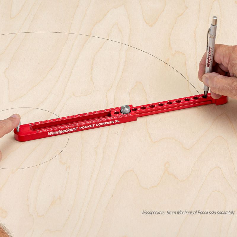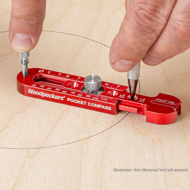 - Woodpeckers Pocket Compass works similarly to a traditional beam compass, except, the beam of the Pocket Compass rests on the surface of your work. That means you’re not trying to balance the whole tool on two sharp points. Simply adjust the two-piece body to your desired measurement, remove the stainless-steel pivot pin from its storage port, spot it into your axis point, drop a pencil through the correct hole and draw your arc. Since the tool is lying flat on your work, you can get a new grip any time you need without losing your place. Gravity is working with you instead of against you.
