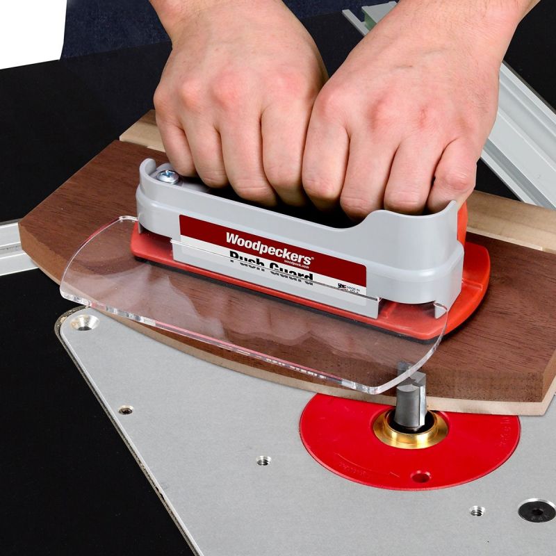 - With the Woodpeckers PushGuard, the guard is always between your hand and the cutter. This provides an additional level of safety that traditional push blocks just can’t match. The clear chip deflector further protects you from flying debris.