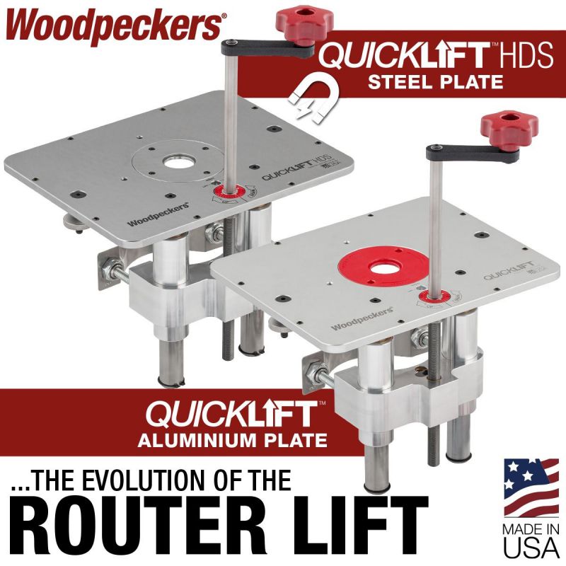 - Which QuickLift is right for you? QuickLift HDS has a Blanchard ground steel plate that works with magnetic featherboards. The twist lock rings for the HDS are also machined from steel. The HDS brings more durability and stiffness to the job. On the other hand, if you're using the same router in your table and for hand-held work, the aluminum QuickLift weighs less and maneuvers in and out of the table easier. Other than the material the plate and inserts are machined from, the two lifts are identical.