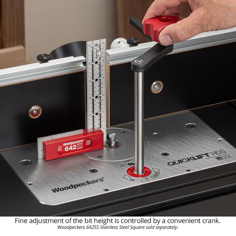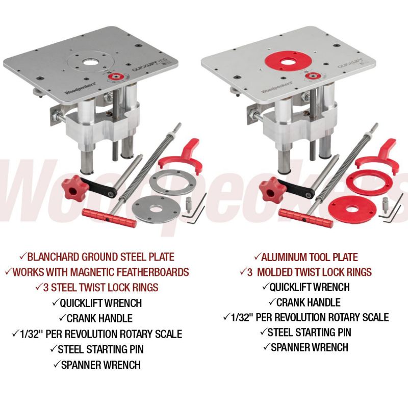 - NEW QuickLift and QuickLift HDS. These new lifts combine the best features of some of our previous models with a new solid steel, precision ground steel plate and twist lock rings (also available with aluminum plate and molded twist lock rings). They also are the first to combine our patented quick-lift feature with crank style micro-adjustment. Instantly lift the collet above the table for bit changes and make coarse adjustments just as fast with the spring-assisted QuickLift Wrench. Then fine-tune the bit position with a comfortable crank handle and an easy-to-read 1/32" per revolution rotary scale. The HDS model adds a precision-ground steel plate and steel twist lock rings. This tank-like router lift will last for decades and the steel lets you use convenient magnetic feather boards. Sizes are available for most popular routers, but if you're shopping for both a lift and a router, we've bundled both lifts with 3-1/4 HP and 2-1/4 HP SpinRite Router Motors.