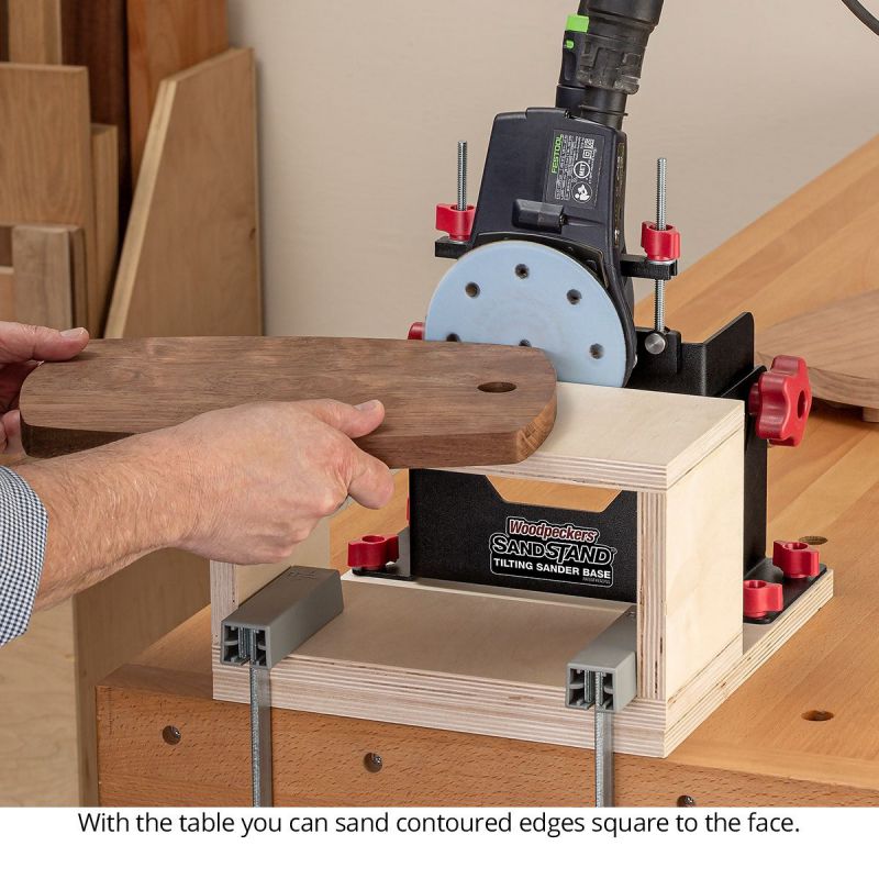 - Turn your palm sander into a versatile stationary sander in seconds with Woodpeckers SandStand Tilting Sander Base. When the workpiece is relatively small, it's easier and safer to hold onto the work instead of holding onto the sander. But stationary belt and disc sanders take up lots of shop space, are a sizable investment and can be overly aggressive and intimidating to use on a small workpiece. SandStand secures almost any round-bodied palm sander in a tilting base you can mount to any workbench. You can even mount it on a wall if you need to. Now you have both hands to control the workpiece as you guide it over your sander. Adjust the angle of the base to hold the sander at the most comfortable position for the job at hand…anywhere between horizontal and vertical.
