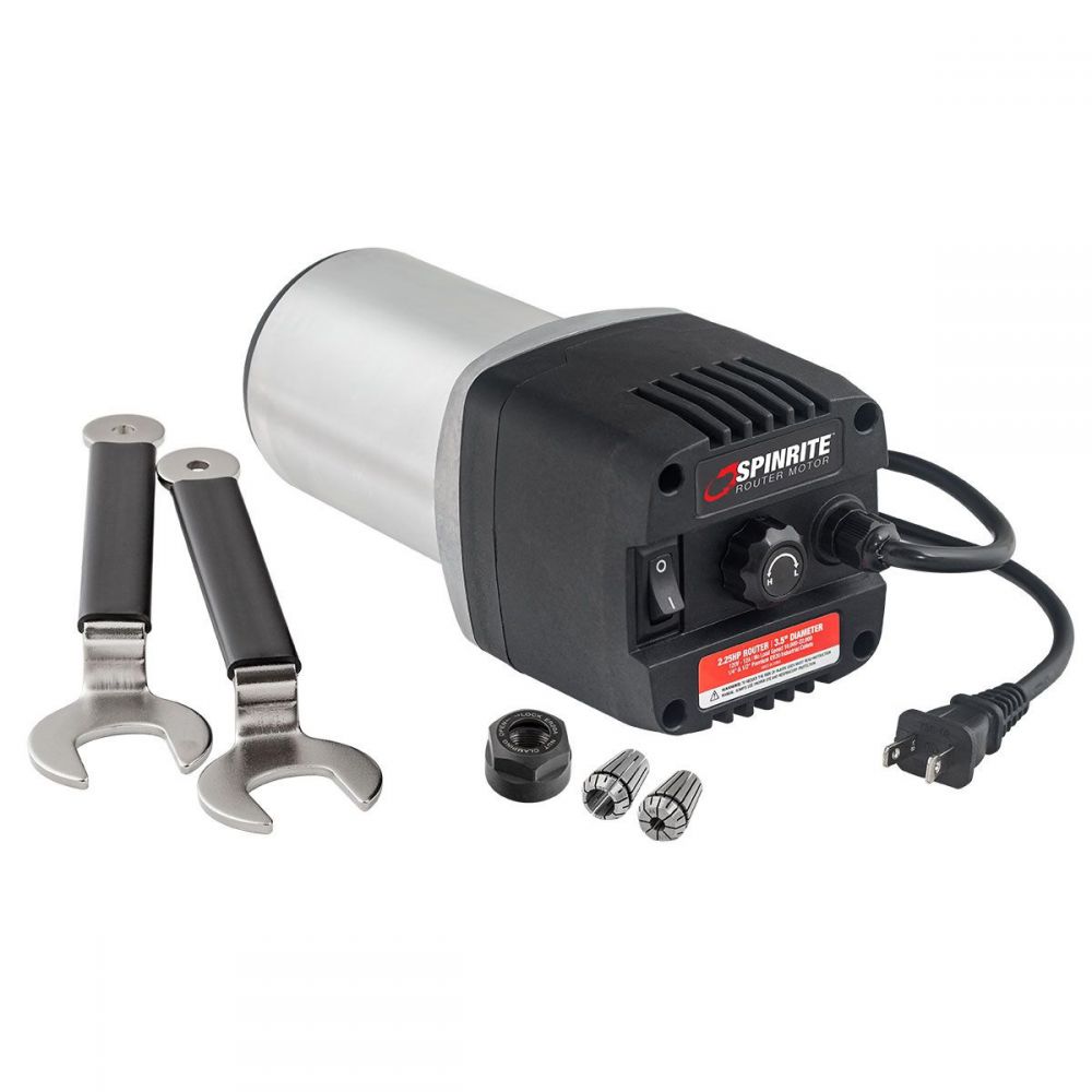 - Whether you’re ploughing a tiny 1/16" vee-groove or doing wide raised panel doors, you can always find the right speed for the job. Just dial it in. The electronics that control the motor’s speed also provide the soft-start feature. The collet wrenches included with the SpinRite are offset, so you can reach down below table level to change bits, if necessary. The 3.25HP motor has a 4.2" cylindrical body while the 2.25HP motor has a 3.5” body, and there are no tabs or pins on either version—making it effortless to mount the motor in most major brands of router lifts, including Woodpeckers PRL V2 420. Even the switch and speed control dial have been positioned optimally for access in lifts and gantries. And, there’s no hand-held base to sit on your shelf and catch dust. This router is built to be part of a routing system, period.